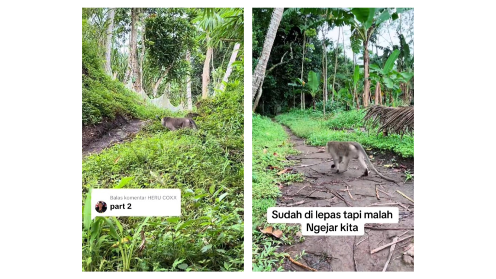Monyet tersebut kemudian dilepaskan ke sebuah area yang masih dekat dengan permukiman, meskipun di sekitarnya terdapat pepohonan. Pelepasliaran dilakukan secara mandiri, tanpa proses rehabilitasi yang memadai, dan kehadiran kelompok monyet lainnya. Padahal, monyet ekor panjang tidak dapat dilepasliarkan sendirian mereka adalah hewan sosial yang hidup berkelompok. Jika dilepas tanpa kelompok dan proses adaptasi, hal ini justru berisiko menimbulkan konflik, baik dengan manusia maupun satwa lain di sekitarnya.